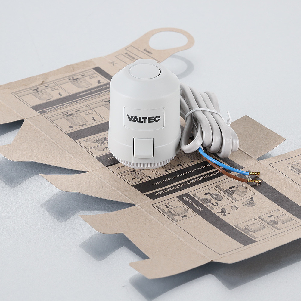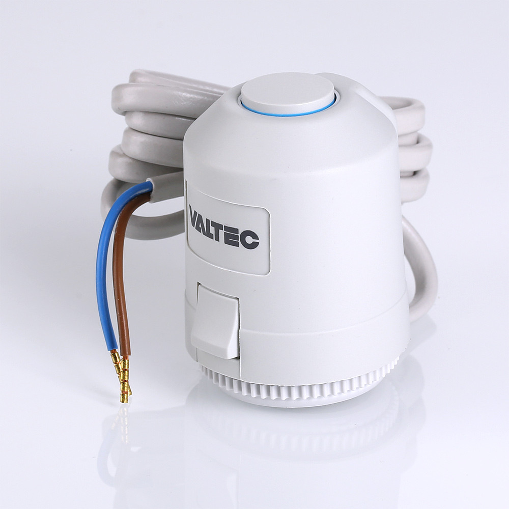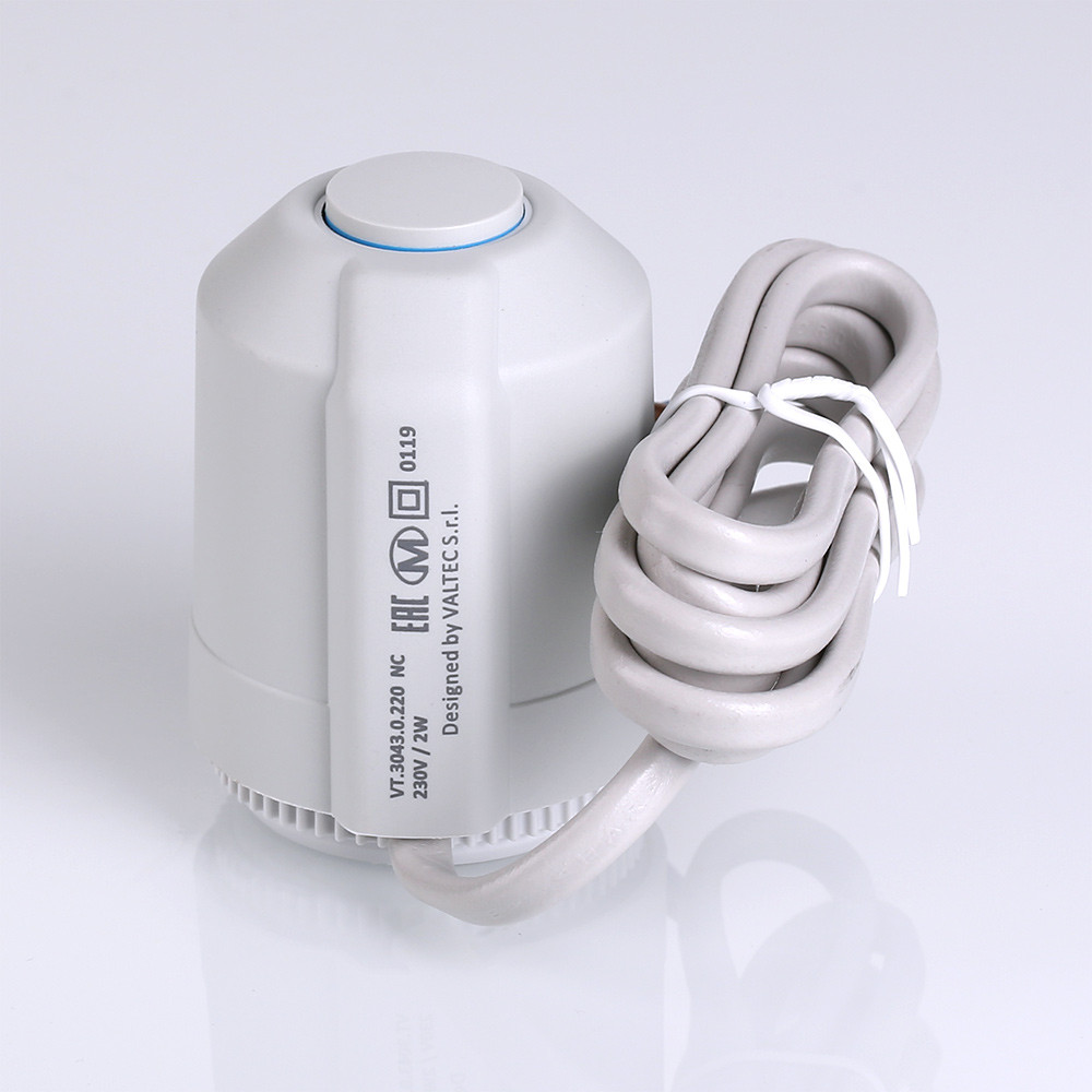 Электротермический двухпозиционный сервопривод VT.TE3043 применяется для автоматического управления радиаторным или коллекторным термостатическим клапаном систем водяного отопления (в том числе теплого пола) и охлаждения зданий. Действие привода основано на расширении заполняющего сильфон армированного парафина при протекании электрического тока через встроенный нагревательный элемент по сигналу от комнатного термостата или контроллера.