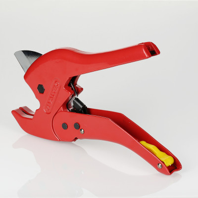 Ножницы с храповым механизмом для металлополимерных и пластиковых труб (до 40 мм). Обеспечивают разрезание под прямым углом труб указанного диаметра. Конструкция инструмента включает в себя нож из нержавеющей стали, храповой механизм, подпружиненную защелку, фиксирующую ножницы в закрытом положении. Внутри рукоятки расположена пружина, поднимающая нож.| Артикул | Размер | Цена за штуку |