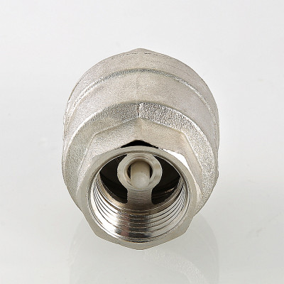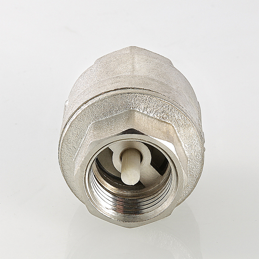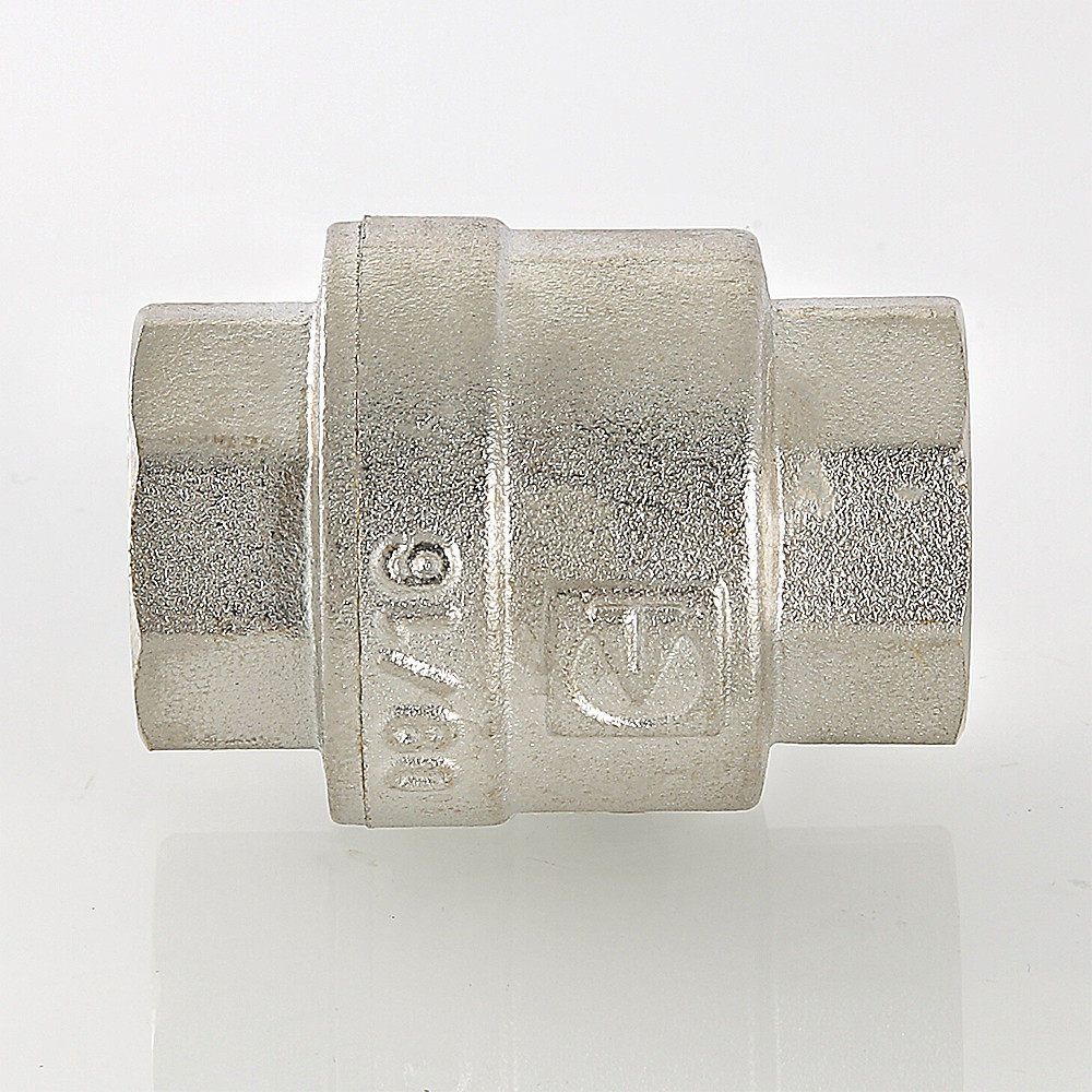 Пружинный обратный клапан с золотниковым механизмом (шток, верхняя, нижняя тарелки) из нейлона (стеклонаполненный полиамид), отличающегося механической, термической, химической стойкостью. Материал пружины – нержавеющая сталь AISI 306. Корпус изделия изготовлен способом объемного горячего штампования из высококачественной латуни CW617N (евростандарт EN12165) с нанесением гальванопокрытия (никелирование). Диапазон рабочих температур: –20… +90 °С. Номинальное давление – 25–40 бар (зависит от типоразмера). Резьба присоединения – внутренняя. Направление потока указано стрелкой на корпусе. Данный обратный клапан монтируется в любом положении, трущиеся поверхности отсутствуют.