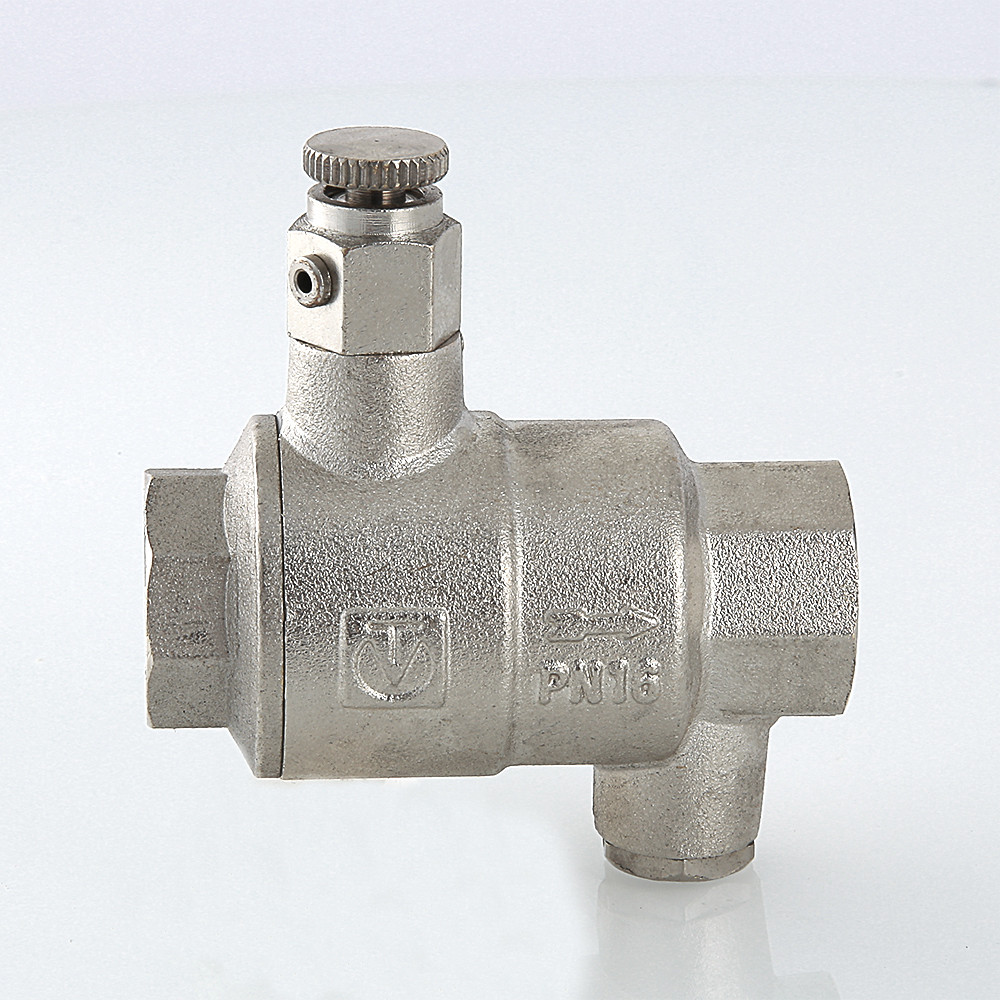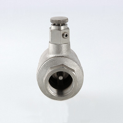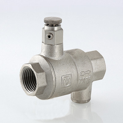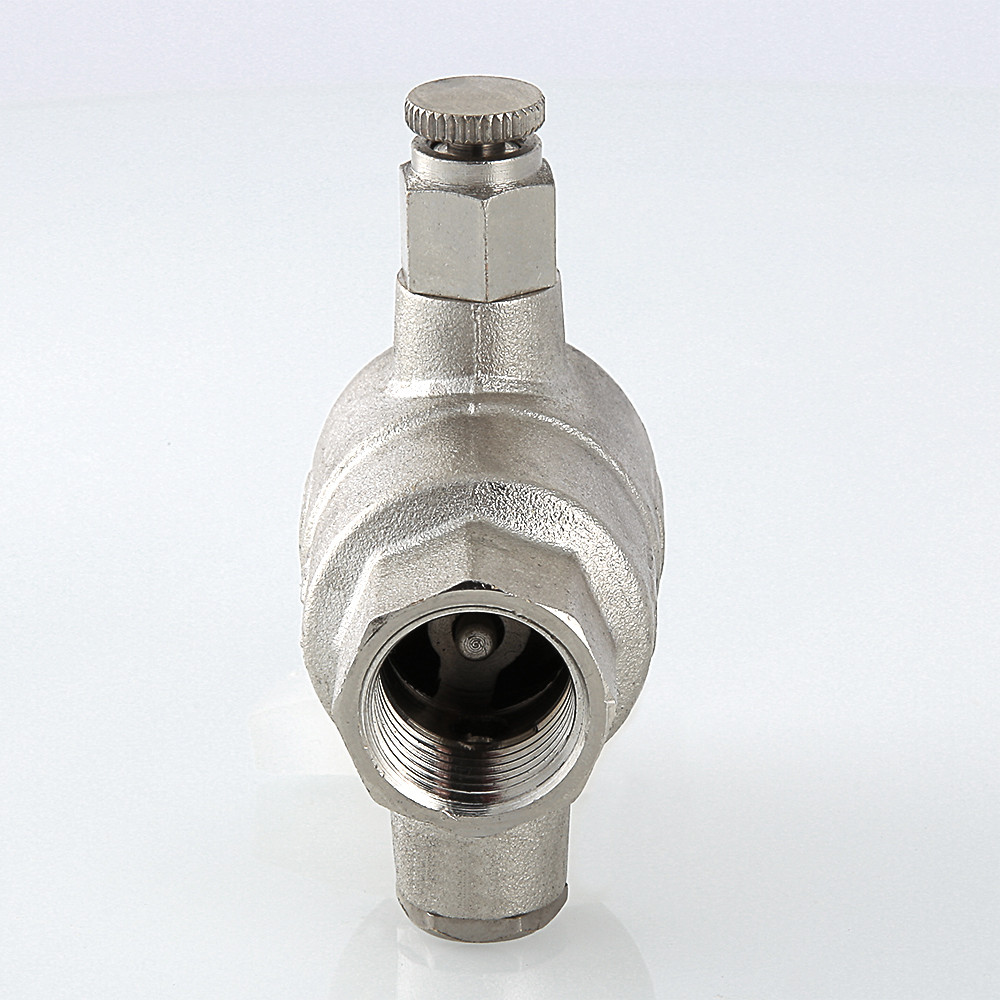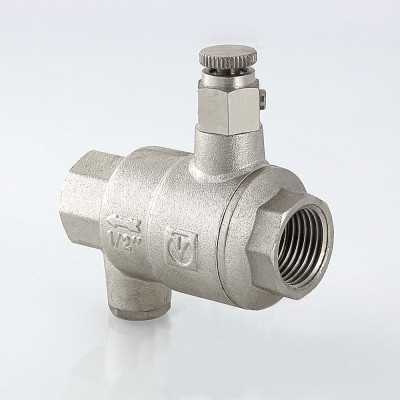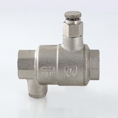 Обратный клапан с дренажем и воздухоотводчиком – комбинированное устройство с функциями защиты от обратного движения рабочей среды, слива воды после клапана, удаления воздушных пробок при вертикальной установке арматуры. Ручной воздухоотводчик и дренажная пробка (входят в комплект) вкручиваются в патрубки с внутренней резьбой диаметром 1/4". При горизонтальном монтаже клапана воздухоотводчик не требуется, вместо него можно установить манометр. Материал корпуса изделия – латунь CW617N с никелевым гальванопокрытием, штока, тарелки золотника – ABS-пластик, золотникового уплотнения – EPDM, пружины – нержавеющая сталь марки AISI 316. Устройство рассчитано на эксплуатацию при температуре рабочей среды от –20 до +90 °С. Минимальный перепад давлений открытия – 0,025, закрытия – 0,05 бара.