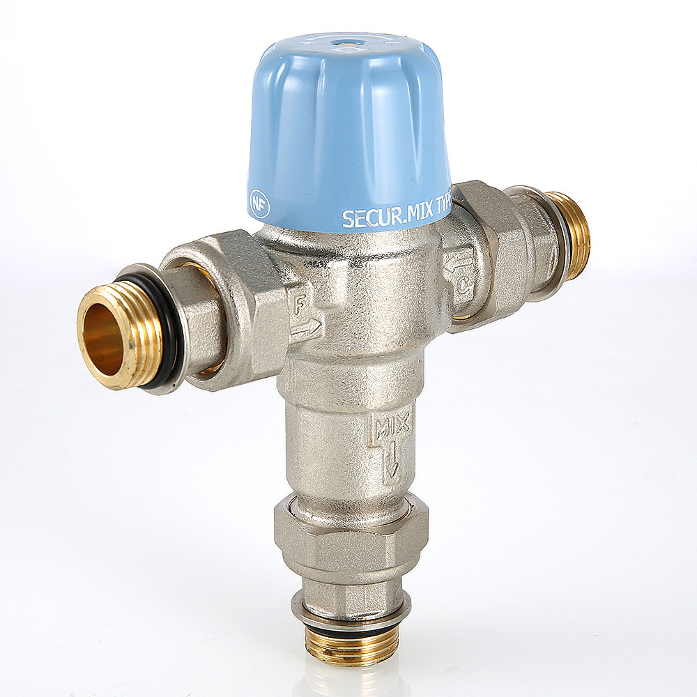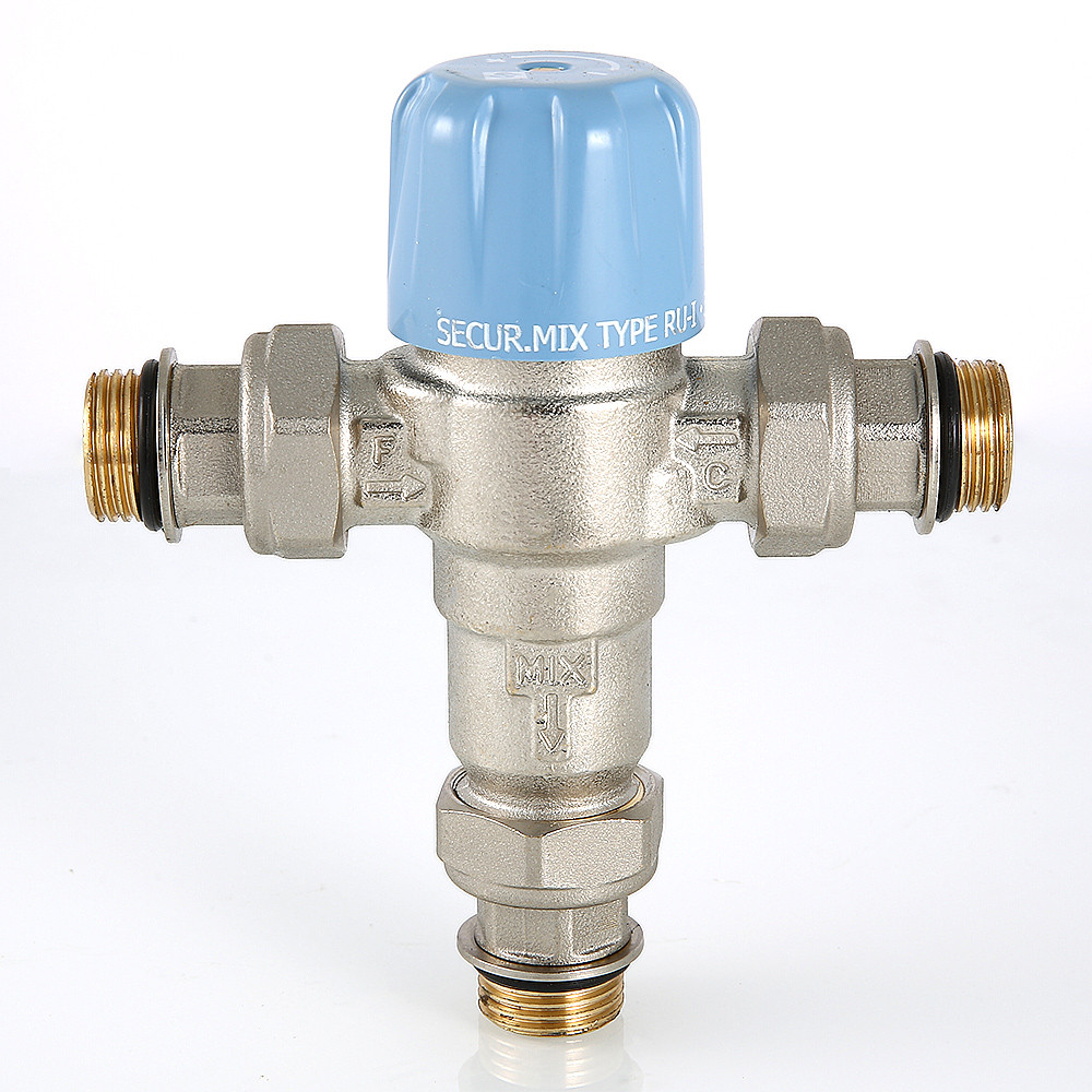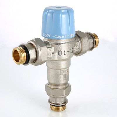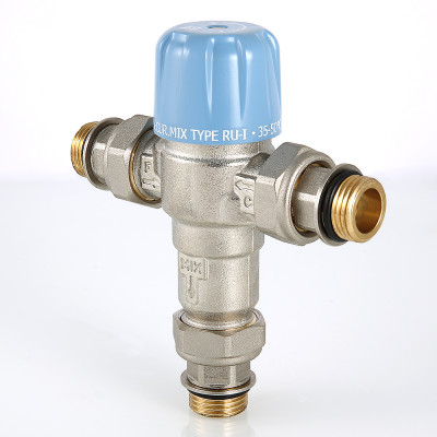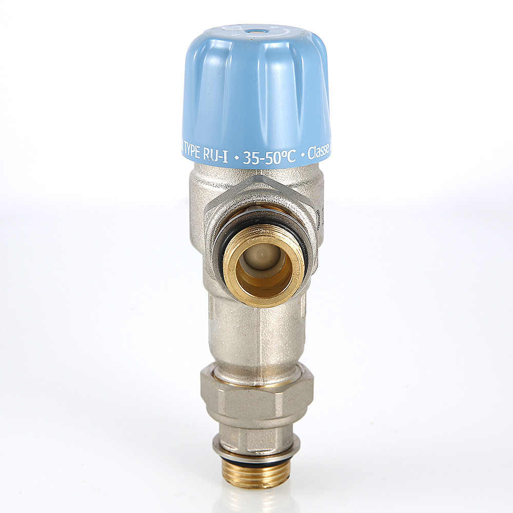 Трехходовой термостатический смесительный клапан с изменяемой в диапазоне от 30 до 50 °C настройкой. Предназначен для автоматического поддержания заданной температуры в системе горячего водоснабжения. Ее превышение исключается даже при полном отключении холодной воды, что позволяет использовать смеситель в школах, детских садах, других общественных зданиях. Термостат оперативно реагирует на изменение температуры и давления входящих потоков. Клапан выполнен из качественной латуни, никелирован. Встроенный термочувствительный элемент – твердотельный (армопарафин). Патрубки клапана соединены накидными гайками с полусгонами. Резьба присоединений – внешняя. Входы смесителя комплектуются обратными клапанами из нейлона. Максимальная температура на входе горячей воды – 90 °C, допустимое рабочее давление входных потоков – до 10 бар.