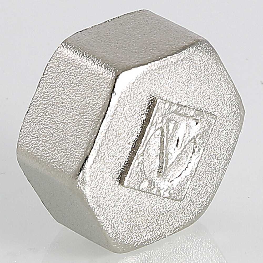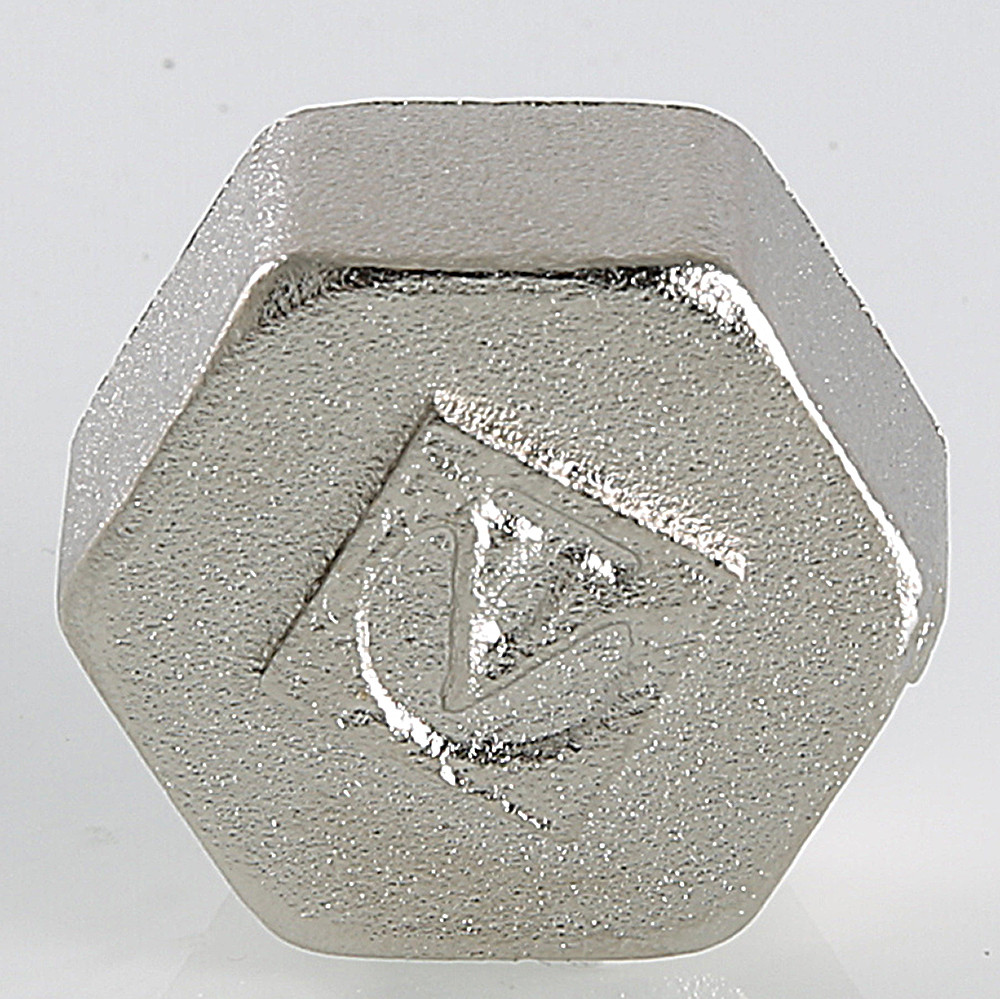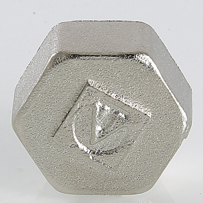 Латунная никелированная трубопроводная заглушка с шестигранной головкой. Имеет внутреннюю трубную цилиндрическую резьбу по ГОСТу 6357 (ISO 228, EN 10226), совместимую также с наружной конической трубной резьбой по ГОСТу 6211 (ISO R7).