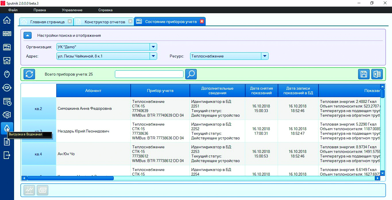 - пользовательское ПО. Эта часть программы позволяет пользователям просматривать показания приборов учета, видеть статистику водопотребления, формировать отчеты за любой интервал времени в формате Еxсel. Удобный интерфейс обеспечивает возможность производить сортировку любого типа – по адресам, по абонентам, по типам энергоресурсов, по номерам приборов учета. При необходимости возможна интеграция со смежными программными комплексами, такими как 1С, ГИС ЖКХ, ЕИЦ и другими.