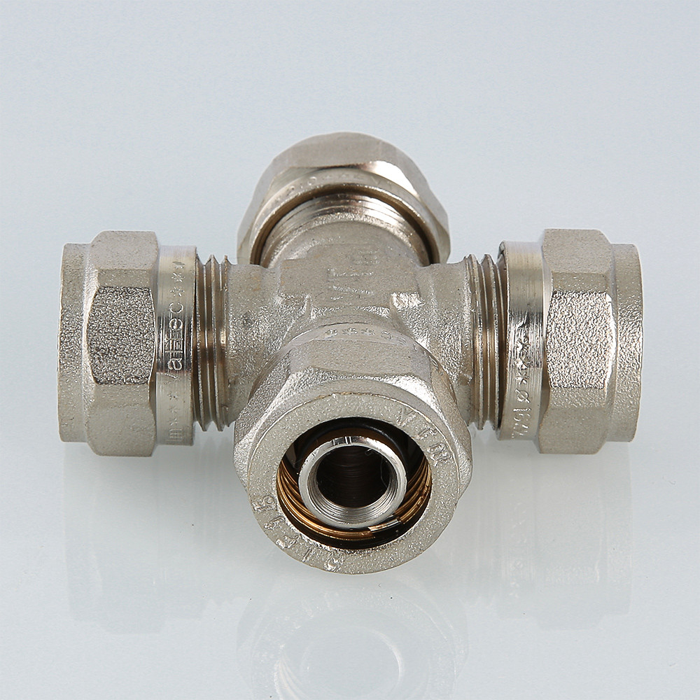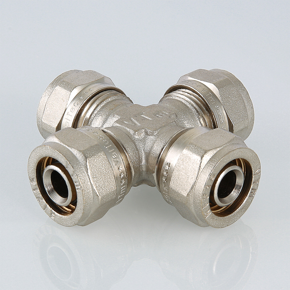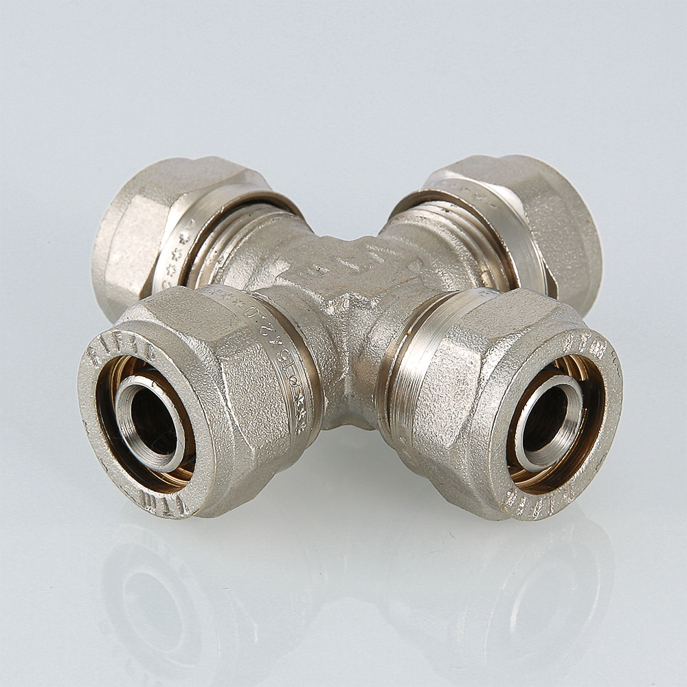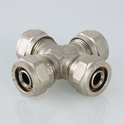 Фитинг обжимной крестовина для присоединения металлополимерных (металлопластиковых) трубопроводов. Предлагаются как равнопроходные модели, так и крестовины с разными диаметрами присоединяемых трубопроводов.