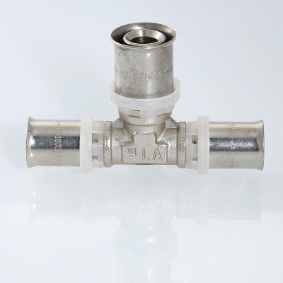 Пресс-фитинг – тройник предназначен для соединения трех труб – металлопластиковых, из сшитого полиэтилена или полиэтилена повышенной термостойкости. Корпус выполнен из сантехнической латуни марки CW617N, уплотнительные кольца штуцеров – из EPDM плотностью 1,22 г/см3, пресс-гильзы – из нержавеющей стали. Нейлоновая обойма выполняет функции фиксатора гильзы, направляющей для пресс-насадок и диэлектрической прокладки, прерывающей контакт между алюминием трубы и латунью корпуса. Конструкция пресс-фитингов VALTEC обеспечивает повышенную пропускную способность, надежность соединений, прочность и термостойкость. Монтаж фитинга производится пресс-инструментом с насадкой «ТН». Типоряд содержит равнопроходные и переходные пресс-тройники.