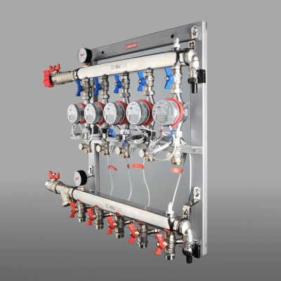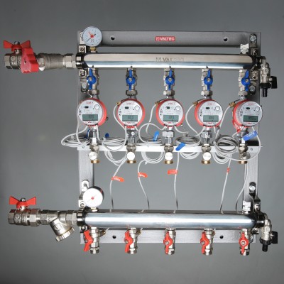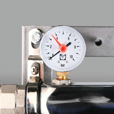 Комплект манометров (опция) на подающий и обратный коллекторы этажных узлов для поквартирного учета тепловой энергии. Включает в себя два манометра VT.TM50.D (нижнее подключение, диапазон показаний давления – 0–10 бар, диаметр корпус – 50 мм), а также два резьбовых фитинга VTr.581.N0402 (футорка 1/2" х 1/4").