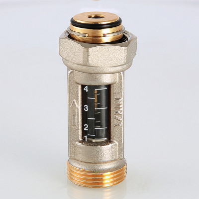 Шкала расходомера отградуирована в диапазоне 1–4 л/мин. Материалы изделия: латунь CW617N (корпус), полипропилен (поплавок), прозрачный поликарбонат (трубка со шкалой), нержавеющая сталь (пружина). Номинальное давление – 10 бар. Пропускная способность – 2,75 м3/ч Присоединение расходомера – «евроконус», накидная гайка/наружная резьба.