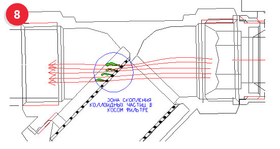 Благодаря наклону колбы навстречу потоку нерастворимые частицы скапливаются в картридже фильтра, не засоряя трубопровод (рис. 7).