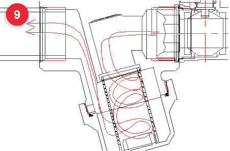 Принудительный разворот потока на 105° по отношению к начальному направлению создает вихревую турбулентность в фильтровальной камере, предотвращая нарастание коллоидных и волокнистых примесей (рис. 9).