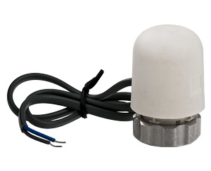 Избавиться от ручного регулирования работы контуров теплого пола можно с помощью комнатных термостатов, расположенных в отапливаемых помещениях. Каждый термостат управляет электротермическим сервоприводом, установленным на соответствующем термостатическом клапане обратного коллектора теплого пола.