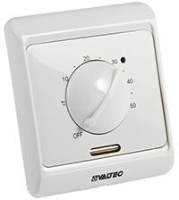 2) Термостат VT.AC602 (рис. 8), оснащенный выносным датчиком температуры пола и выключателем, полностью прекращающим работу термостата. Этот прибор может работать в трех режимах: а) по датчику температуры воздуха (диапазон настройки 5–40 °С); б) по датчику температуры пола; в) по двум датчикам одновременно. В качестве основного датчика выступает датчик температуры воздуха, а датчик температуры пола работает в качестве ограничителя с заводской настройкой 30 °С. Термостат имеет также возможность подключения через внешний таймер, который управляет включением и отключением термостата по заданной временной программе.
