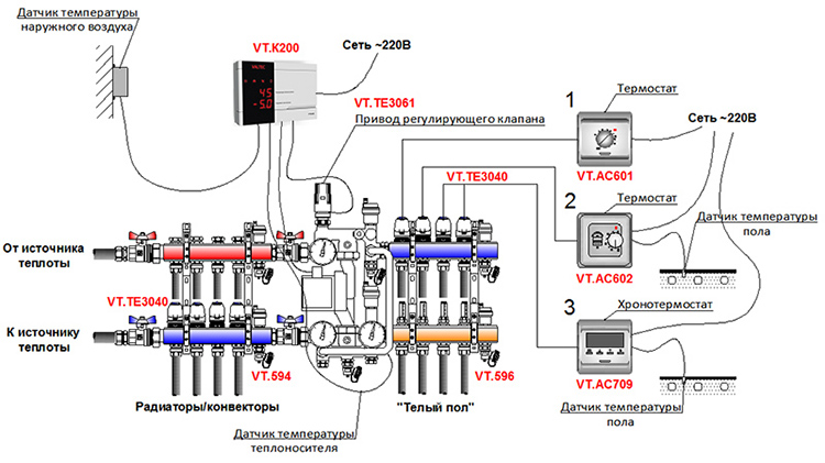 Рассматриваемые в статье комнатные термостаты VT.AC601, 602, 709 работают только от сети 220 В и управляют в системах отопления только нормально закрытыми сервоприводами.