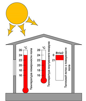 На улице холодно, появилось солнце. Температура поверхности пола составляет 24 °С, а температура воздуха в помещении поднялась за счет солнечной радиации до 22 °С. Разность температур уменьшилась, и соответственно снизился тепловой поток в помещение: ≈ 21 Вт/м2.