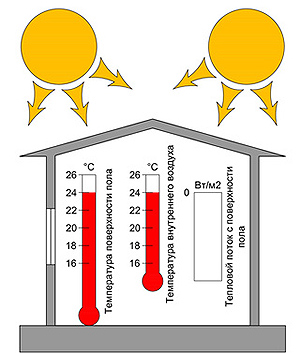 На улице тепло. Температура поверхности пола составляет 24 °С, а температура воздуха в помещении поднялась за счет солнечной радиации до 24 °С. Разность температур отсутствует. Поэтому теплообмена нет. Тепловой поток равен 0 Вт/м2.