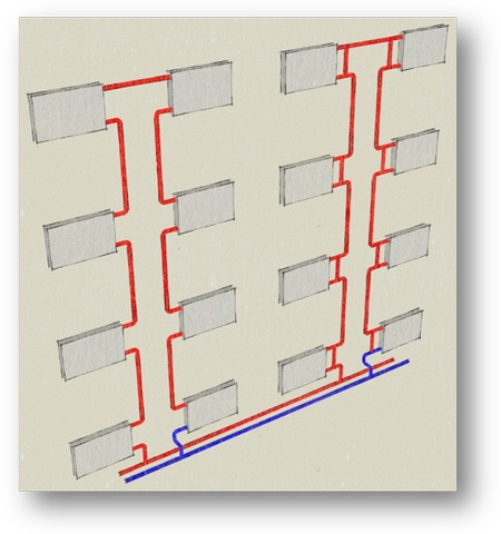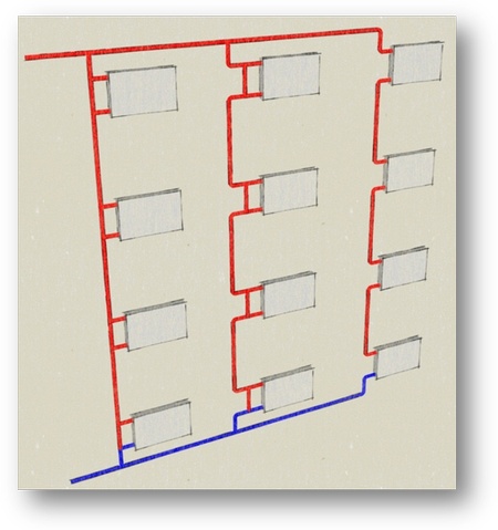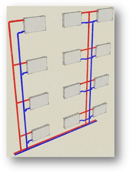 Сегодня в новом строительстве в основном применяются двухтрубные системы отопления, но опять же стоякового типа (рис. 3).