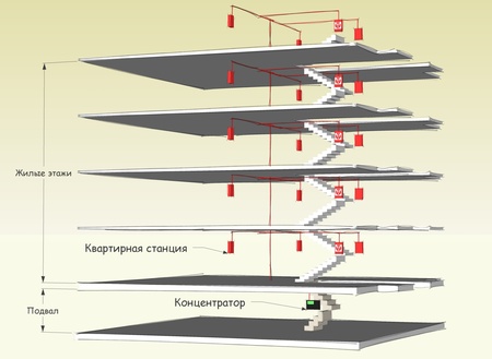 Все станции в здании соединены параллельно по двухпроводной шине M-Bus. В подвале или подъезде в специальной технологической нише устанавливается концентратор, на который поступают данные со всех станций. Считывание показаний производится в двух режимах: