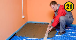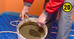 Чтобы проверить систему на герметичность, проводят опрессовку — гидравлическое испытание. Если все в порядке, укладывают армирующую сетку (19) и заливают бетонную стяжку (20, 21). Для изготовления последней применяют цементный раствор с добавлением пластификатора. После чего стяжка должна затвердеть — обычно на это требуется 28 суток. По прошествии данного времени, можно укладывать чи- стовое покрытие и начинать пользоваться системой отопления «теплый пол».
