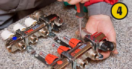 Конструкцию устанавливают в коллекторный шкаф и прикручивают к сгонам латунных шаровых кранов (класс герметичности А). После этого к коллекторному шкафу подводят трубы системы отопления, а к ним, в свою очередь, присоединяют запорные полнопроходные шаровые краны.