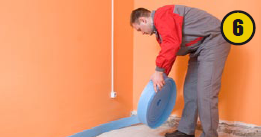 Для компенсации деформаций и уменьшения теплопотерь через стены по периметру размещают демпферную ленту (6). Она предотвратит растрескивание бетонной стяжки при температурном расширении. Ленту следует укладывать так, чтобы после выполнения стяжки и укладки чистового покрытия она выступала над поверхностью. Излишек можно обрезать после окончания всех работ.