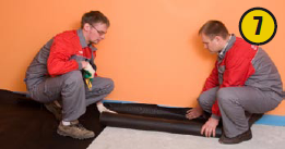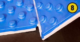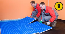 После этого приступают к раскладке пенополистирола. Плиты с покрытием нужны для теплоизоляции, а также служат основой для крепления труб. В том случае, если поверхность подвергается увлажнению снизу, под пенополистирол укладывают слой пароизоляции для исключения образования конденсата (7). Плиты соединяют внахлест при помощи специальных пазов, расположенных по краям (8,9).