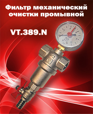 Корпус и колба каскадного самоочищающегося фильтра VT.389 выполнены из латуни марки CW617N (европейский стандарт EN 12165), никелированы. Материал фильтоэлементов – нержавеющая сталь. Предусмотрены дренажный шаровой кран со штуцером для подключения шланга и манометр для контроля уровня загрязненности сеток. Резьба присоединений – внутренняя. В настоящий момент серия