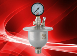 Для контроля работоспособности VT.CAR20, в конструкцию ниппельного штуцера введен миниатюрный шаровой кран с манометром. Жилец в любой момент может открыть шаровой кран и проверить давление в воздушной камере гасителя.