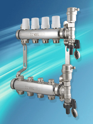 В продажу поступили коллекторные блоки (в сборе) из нержавеющей стали VTс.588, предназначенные для распределения теплоносителя по петлям теплого пола или радиаторного отопления.