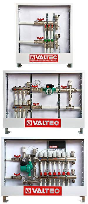 На фото показаны варианты различной комплектации системы теплого пола на основе продукции VALTEC, в том числе – с автоматическим регулированием температуры теплоносителя: с циркуляционным насосом и термостатическим смесительным клапаном (второе изображение сверху), а также с насосно-смесительным узлом VT.COMBI и коллекторным блоком VTc.596 (нижнее изображение). Последний из представленных вариантов комплектации обеспечит эффективную работу теплого пола на площади от 80 до 120 кв. м. Более подробную информацию можно получить, обратившись по адресу info@valtec.ru.